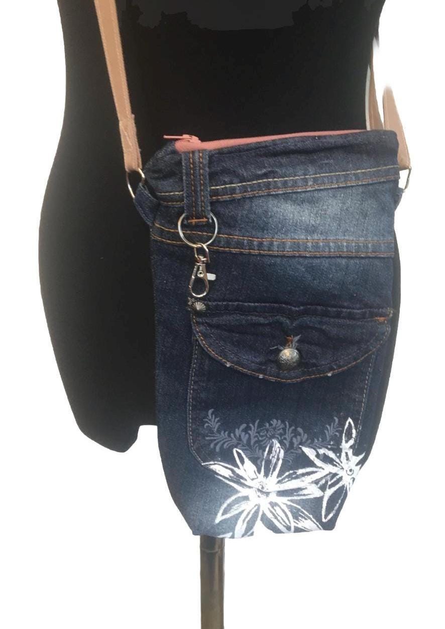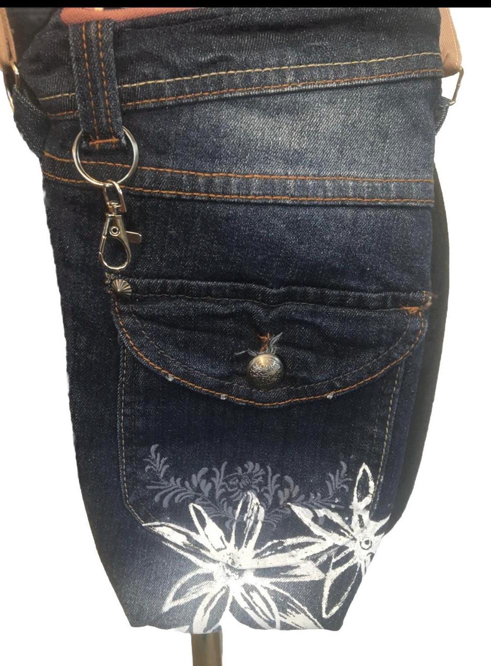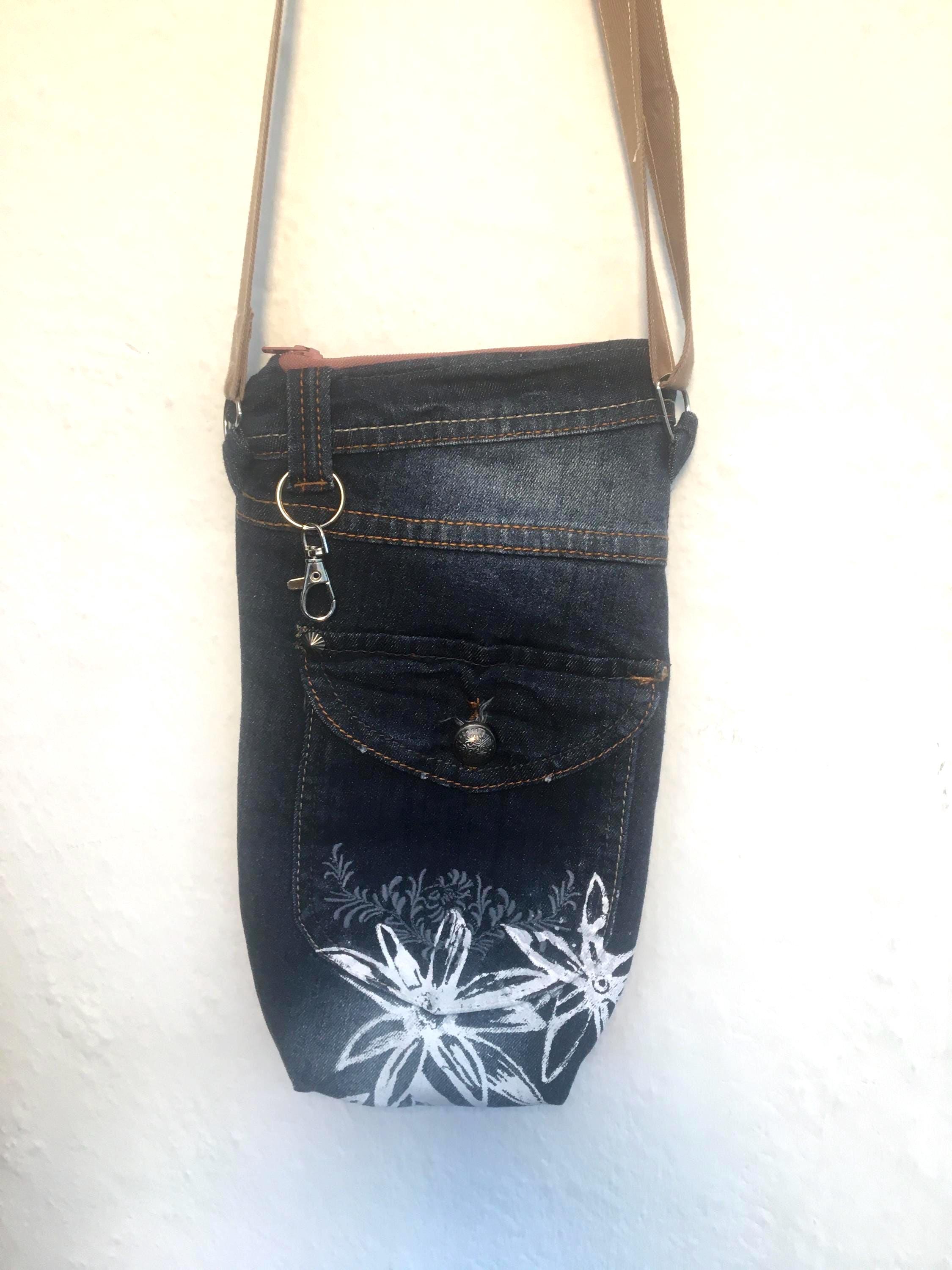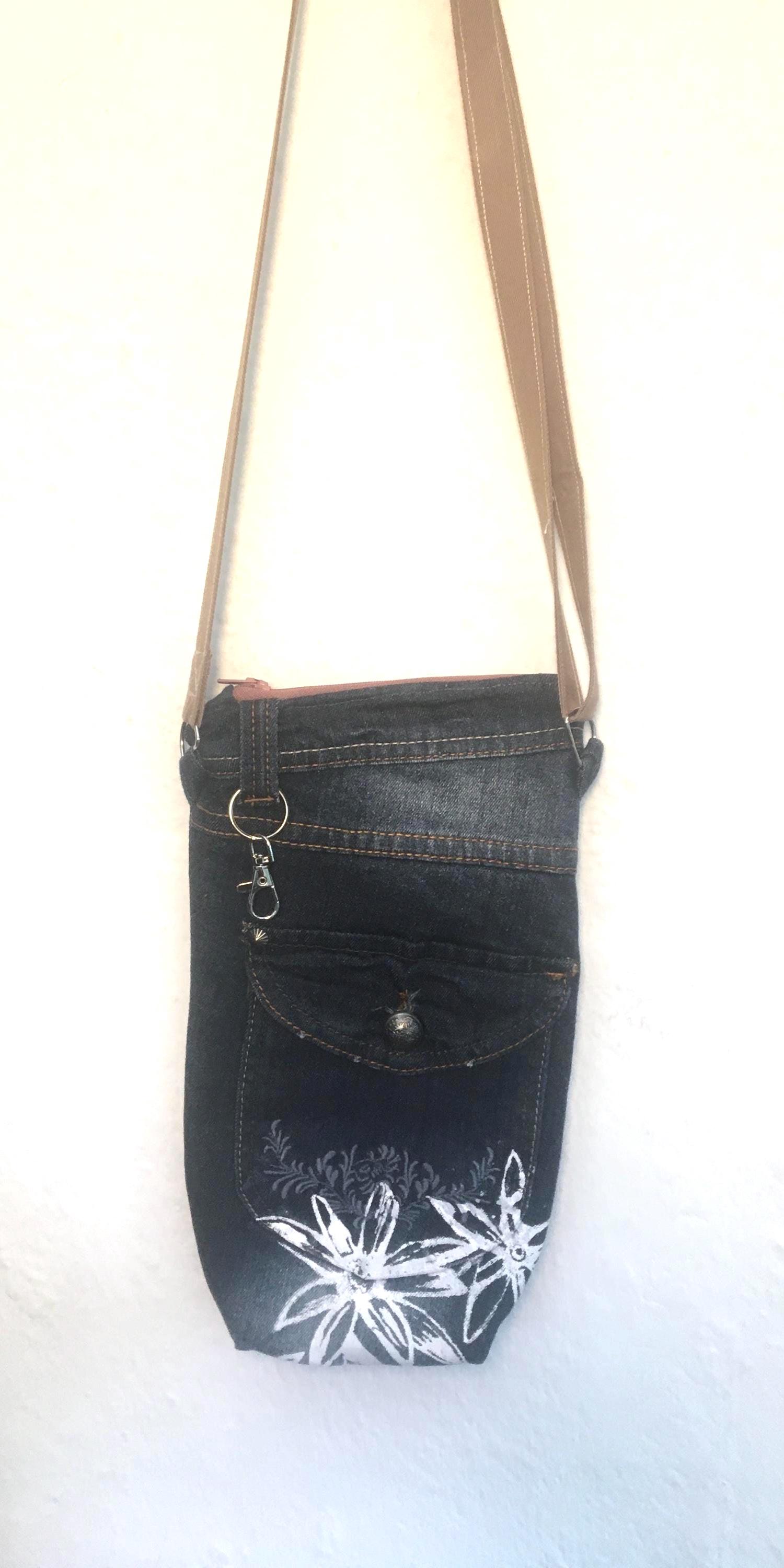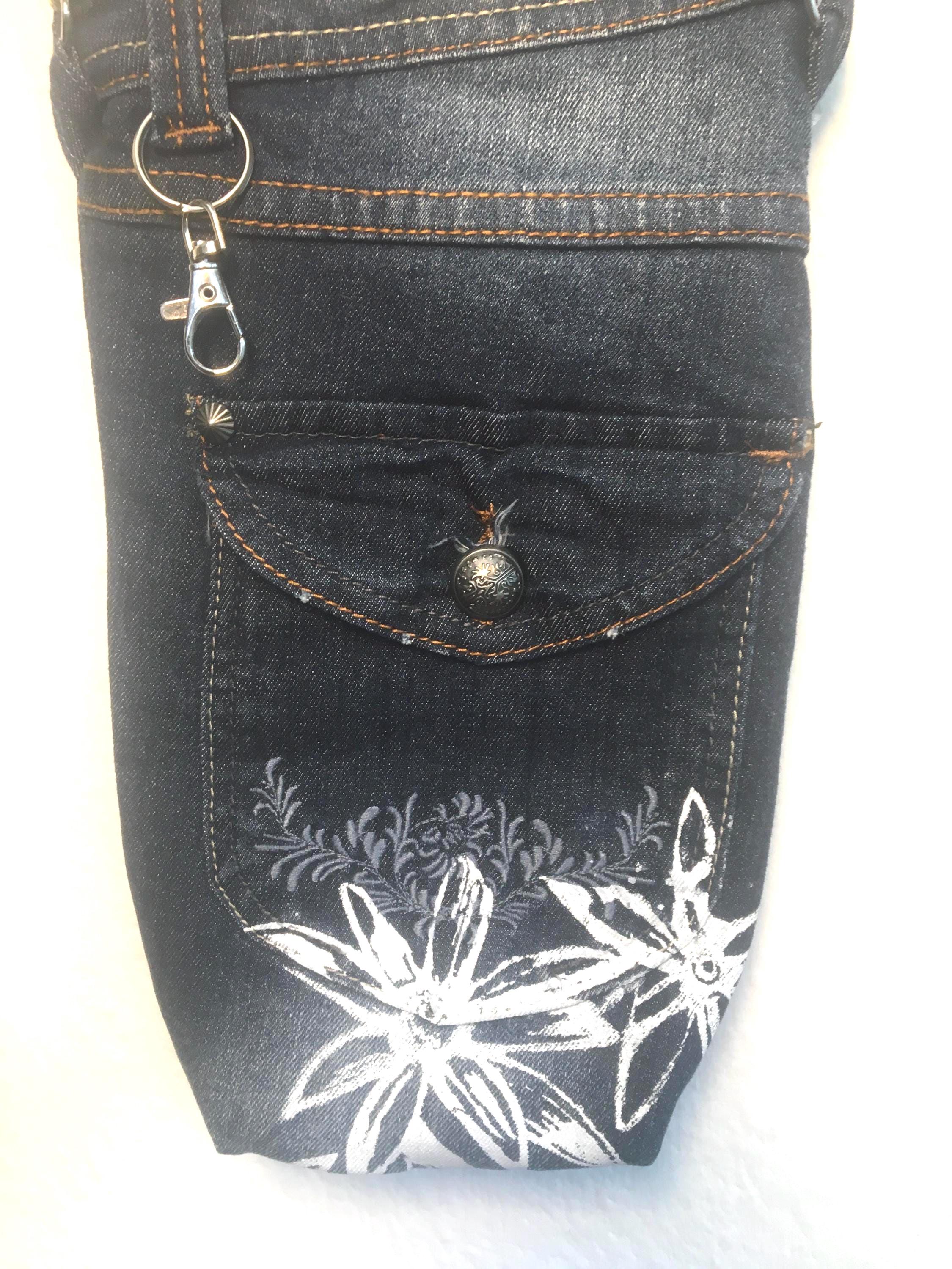 Up-cycled from denim jeans fabric remnants. This bag is printed with a white floral handprinted pattern , which has been screen printed onto the fabric from my own unique design, this small bag is fully lined.
