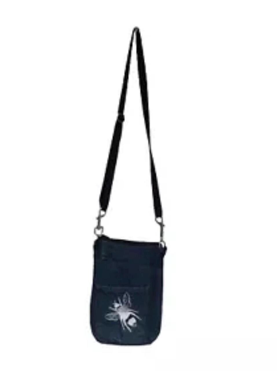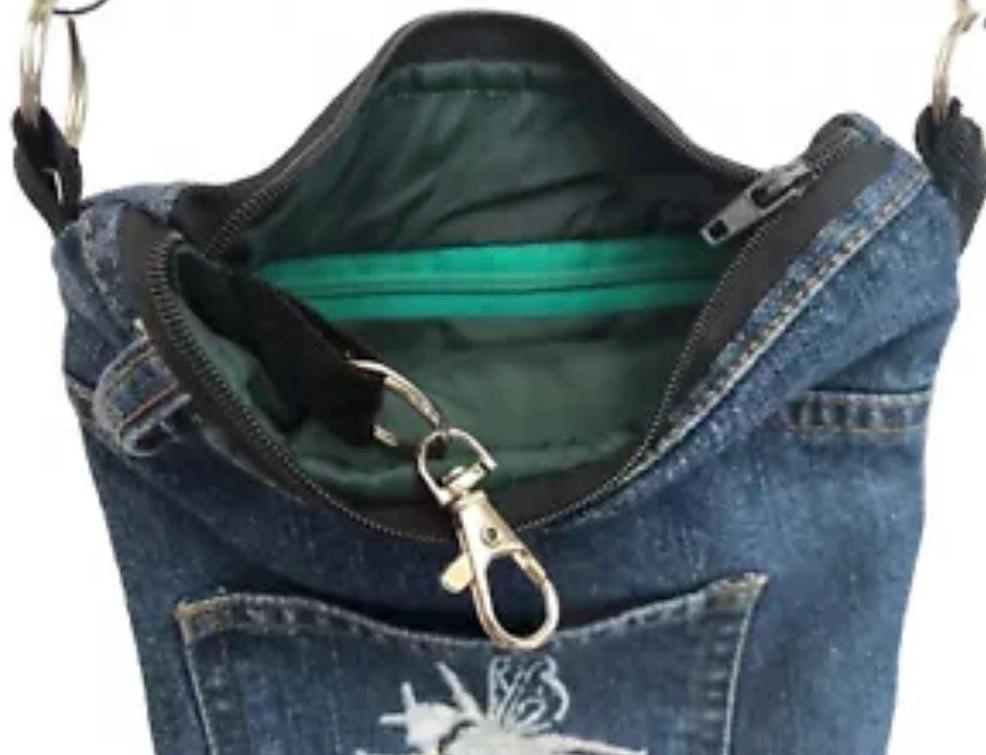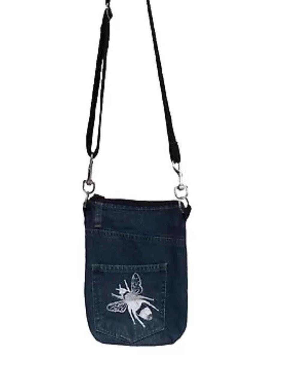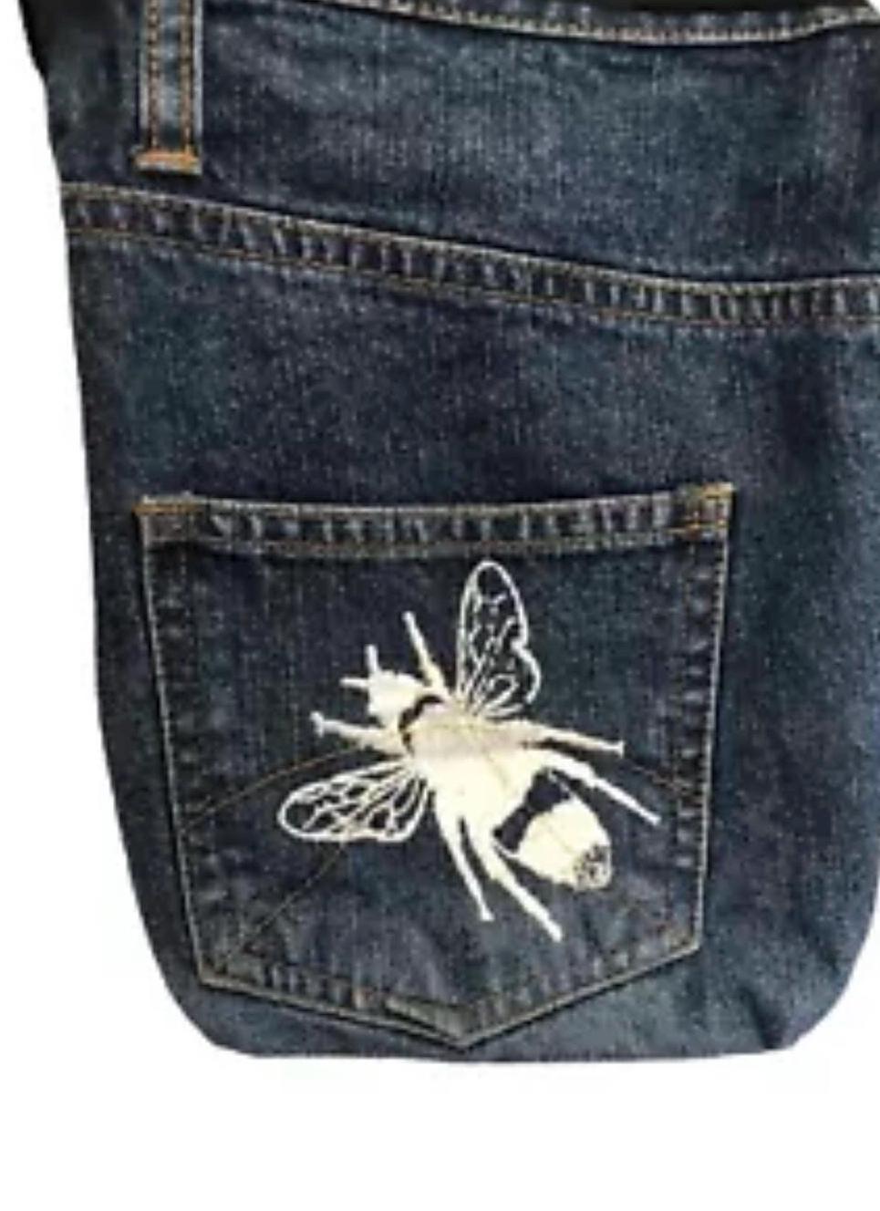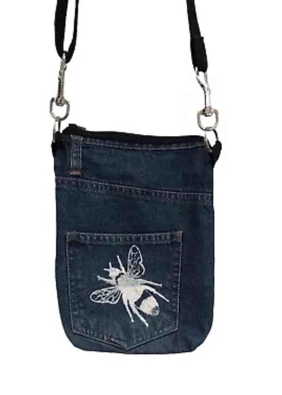 Up-cycled from denim jeans fabric remnants. This bag is printed with a white handprinted bee, which has been screen printed onto the fabric from my own unique design, this small bag is fully lined.