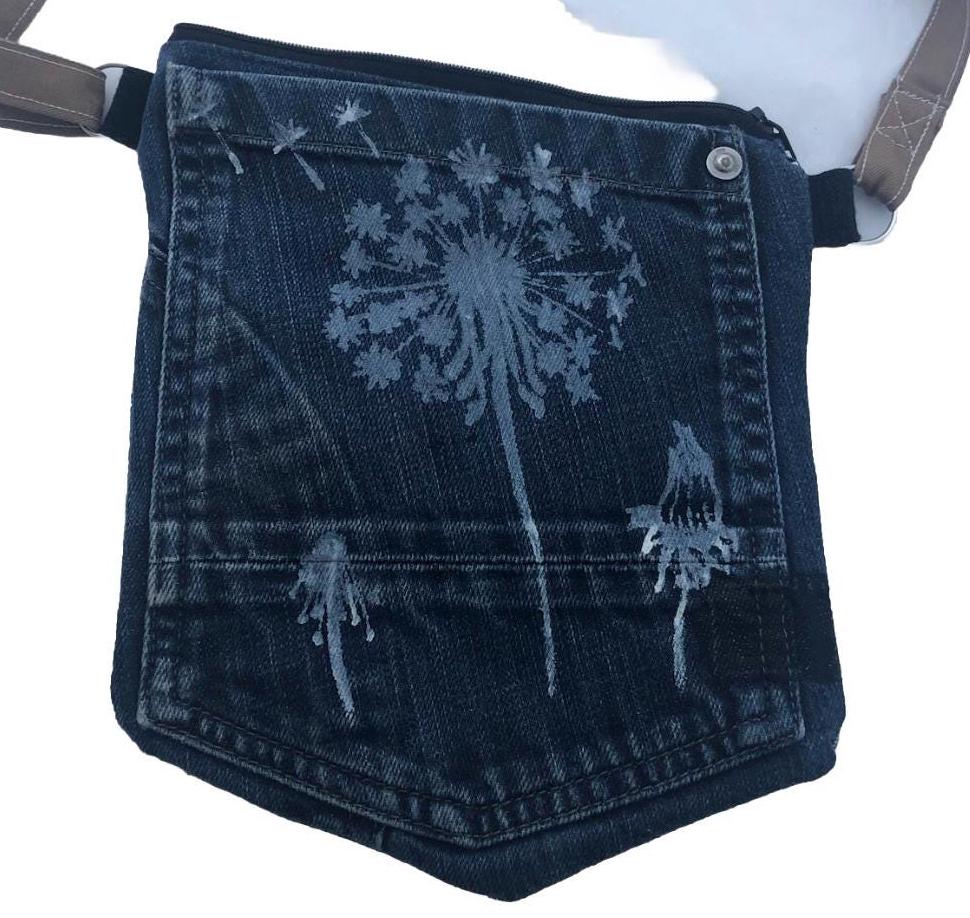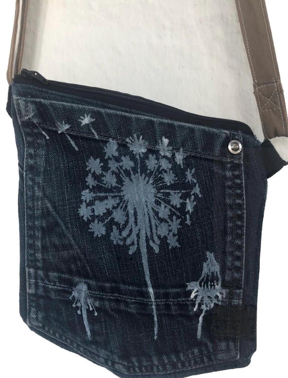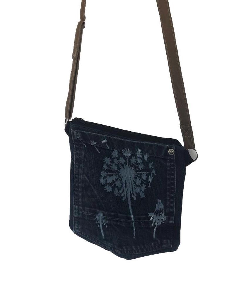 Up-cycled from denim jeans fabric remnants. This bag is printed with a white dandelion handprinted pattern , which has been screen printed onto the fabric from my own unique design, this small bag is fully lined with an interior pocket.