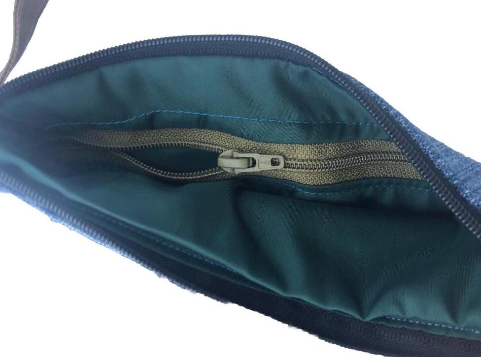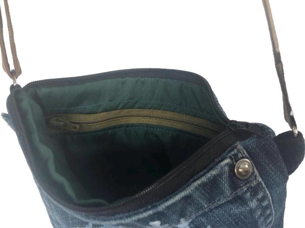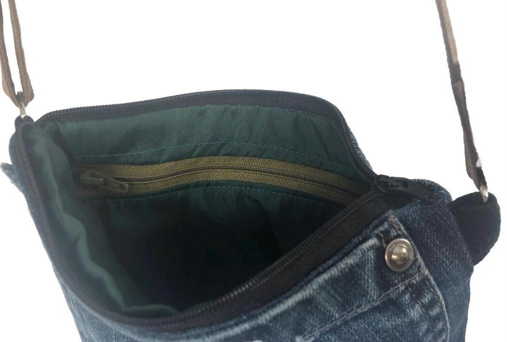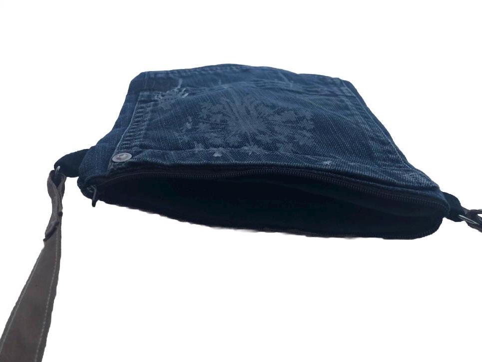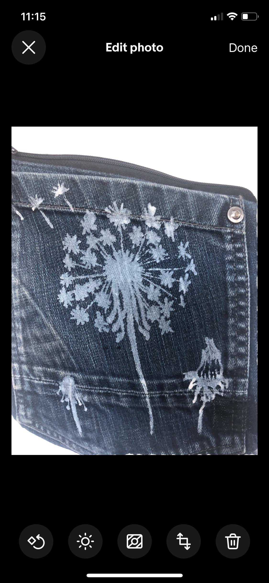 Up-cycled from denim jeans fabric remnants. This bag is printed with a white dandelion handprinted pattern , which has been screen printed onto the fabric from my own unique design, this small bag is fully lined with an interior pocket.